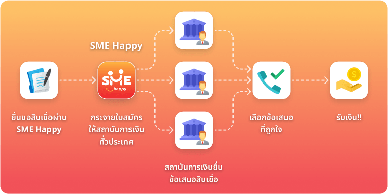 เมื่อยื่นขอสินเชื่อผ่าน SME Happy เรียบร้อย จากนั้น SME Happy จะเป็นตัวกลางในการส่งเอกสารการสมัคร ไปให้หลาย ๆ สถาบันการเงินทั่วประเทศ โดยที่คุณไม่ต้องสมัครด้วยตัวเองหลาย ๆ ครั้ง